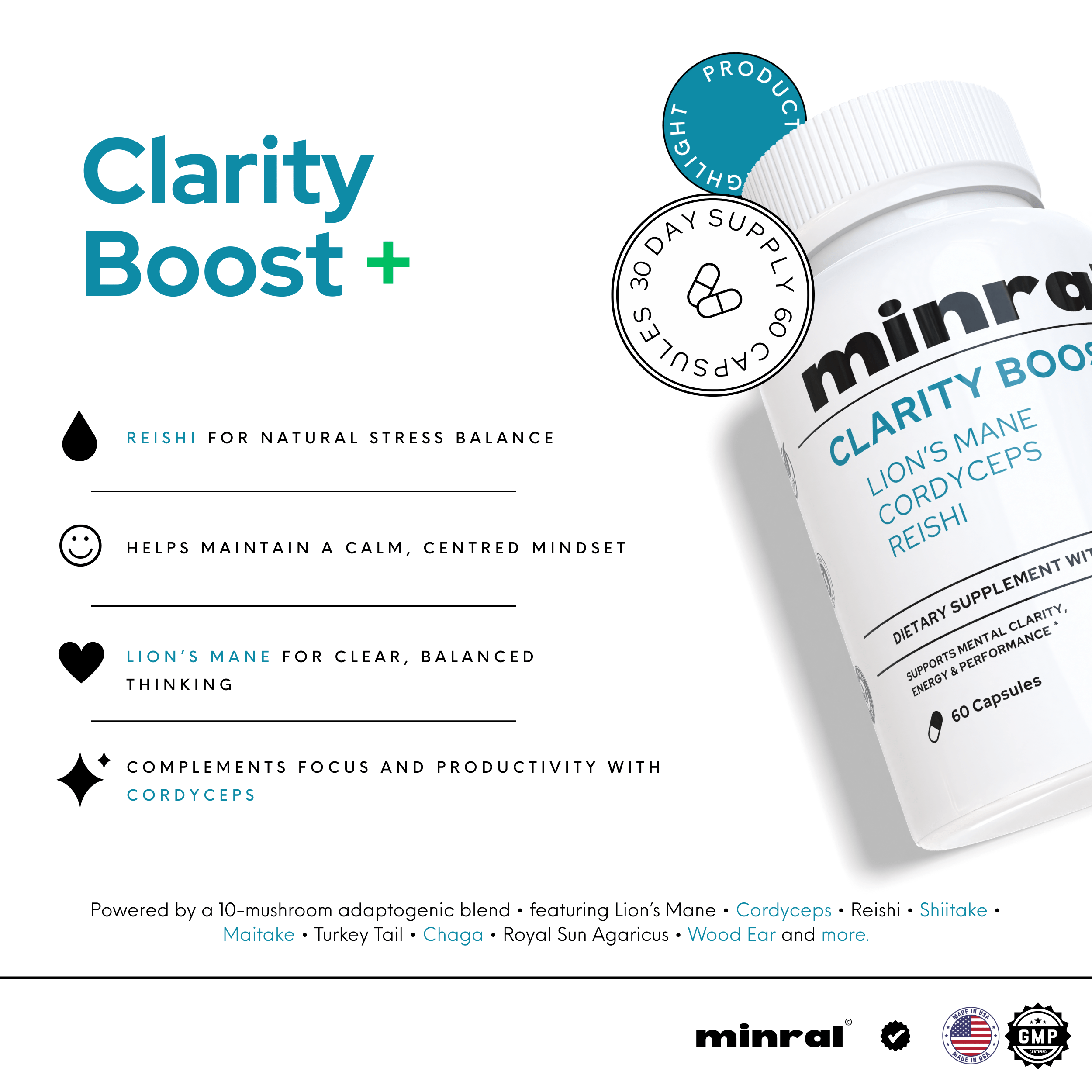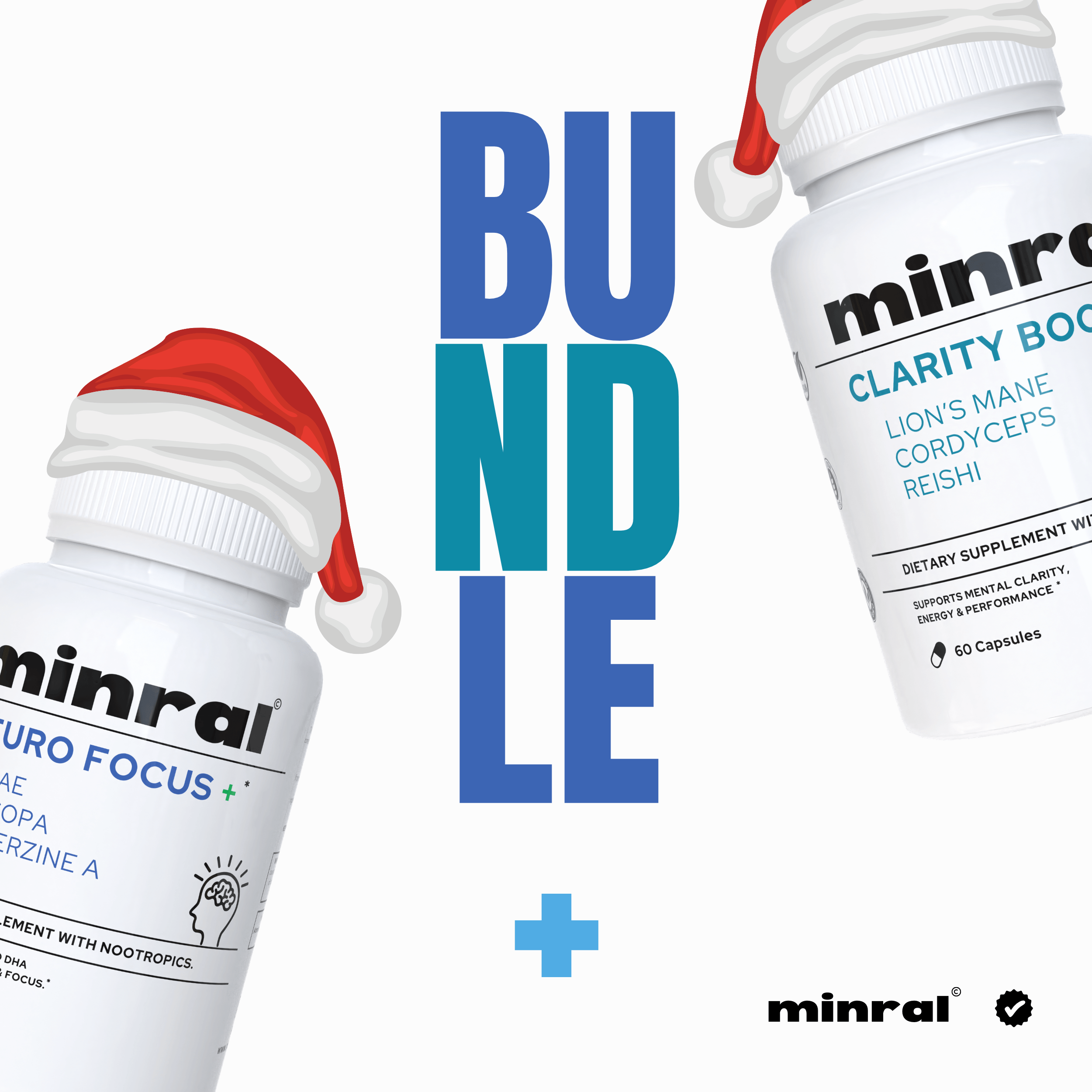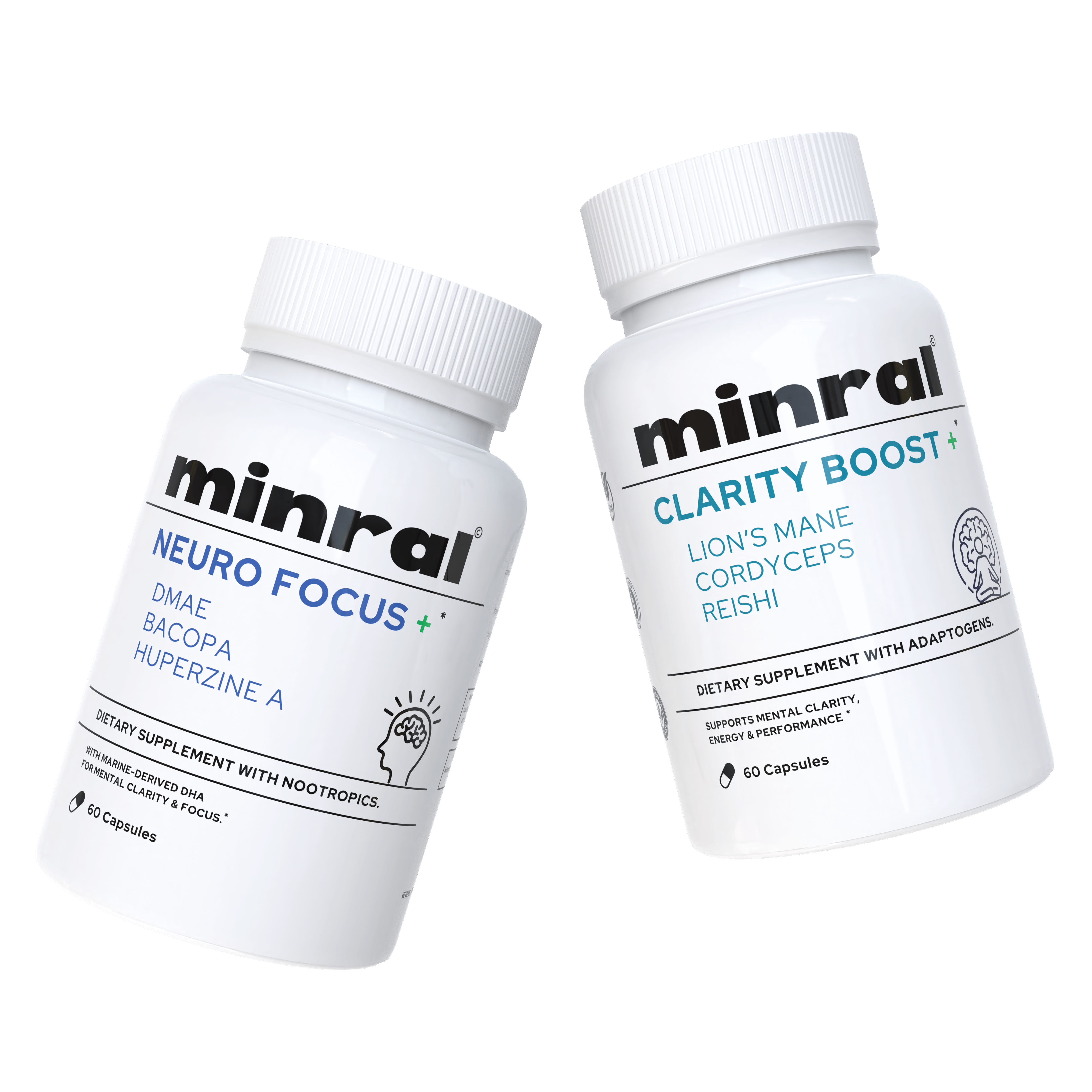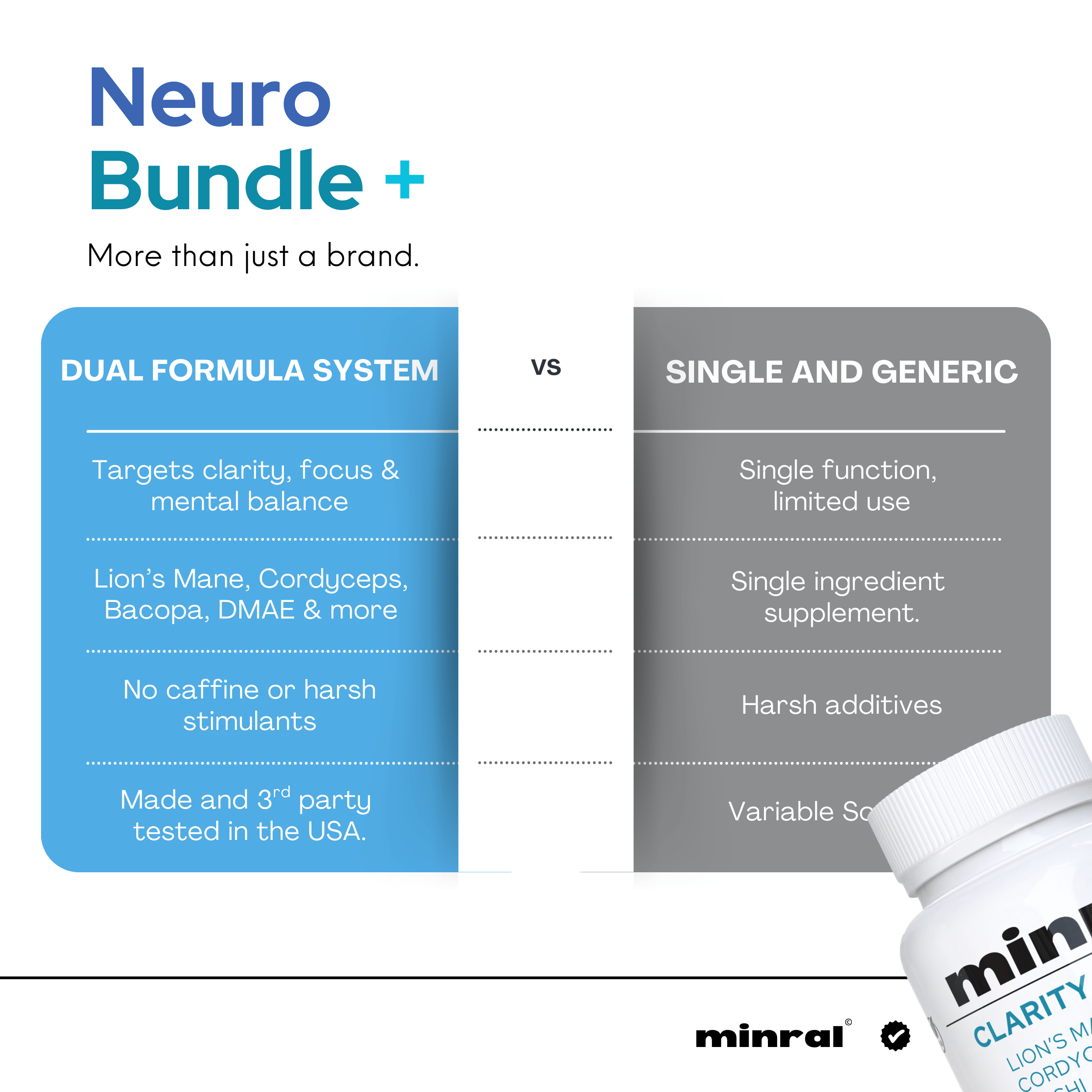 Take two capsules of each formula daily — ideally both Neuro Focus + and Clarity Boost + in the morning/mid-day to support focus, energy and retention throughout the day.